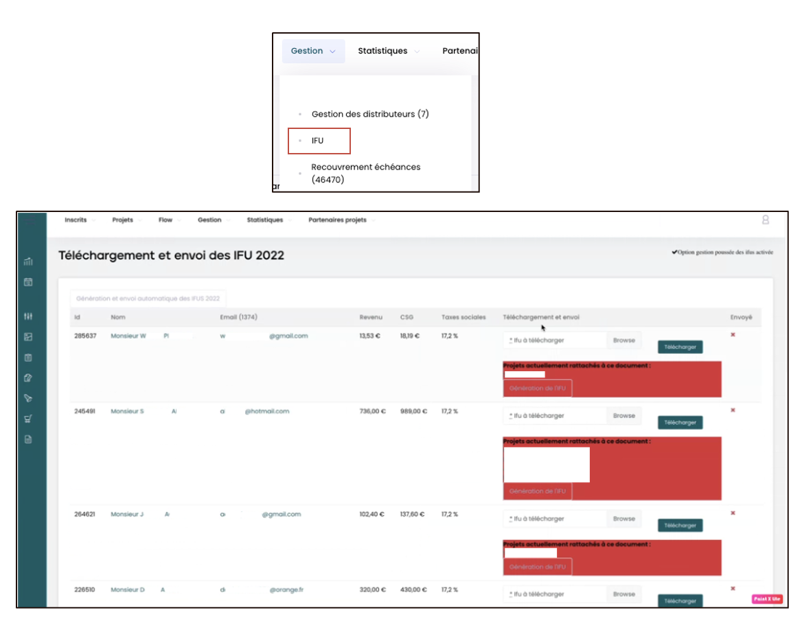 - Pour générer les IFU niveau projet, accédez à l’onglet dédié via « Gestion » puis « IFU ».