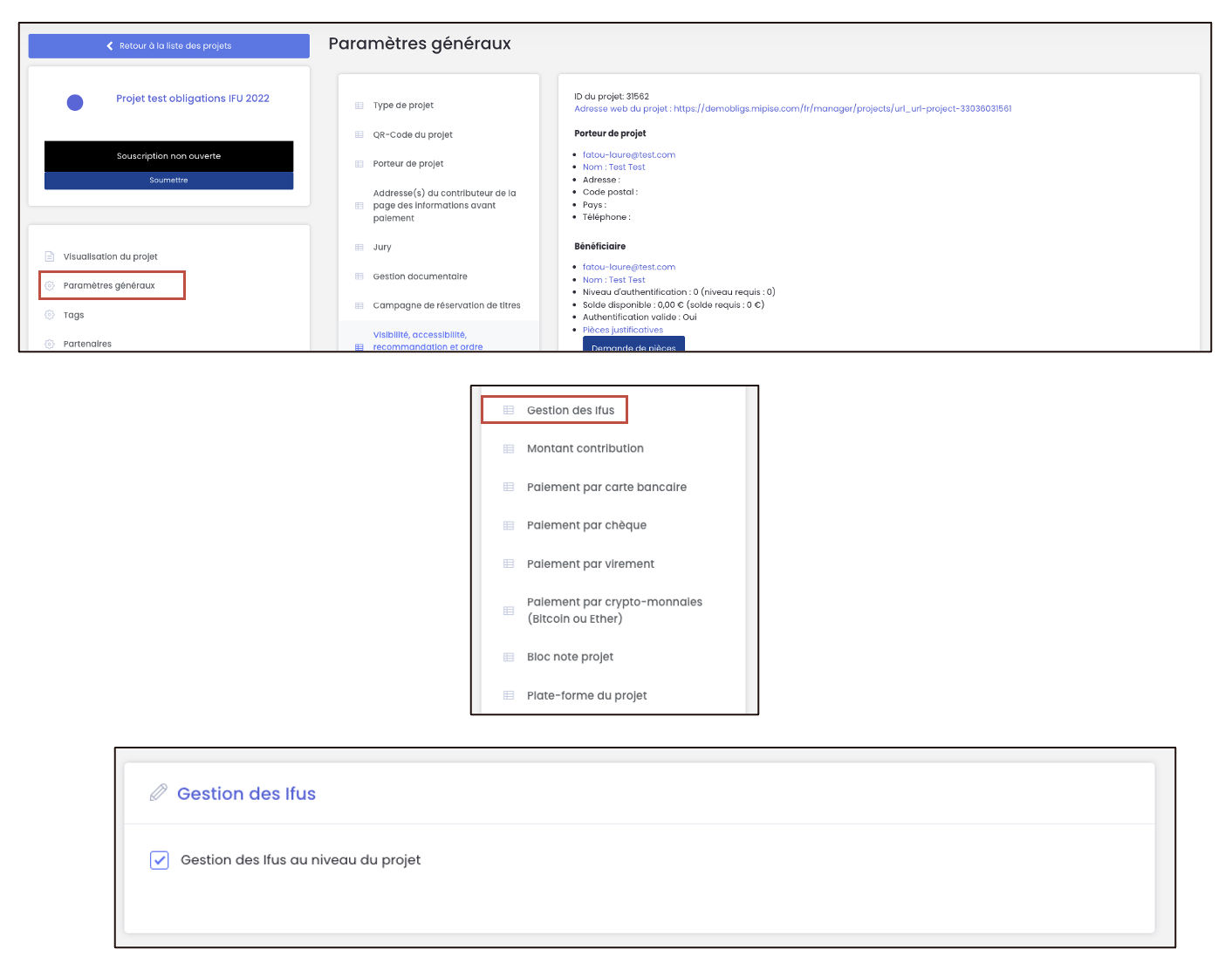 1) La génération IFU au niveau projet est bien activée dans les paramètres de ce dernier. Pour cela, rendez-vous dans les paramètres du projet, au niveau des paramètres généraux. Vous pouvez dès lors activer la fonctionnalité dans la rubrique « Gestion des IFU ». Attention à bien enregistrer vos modifications en cliquant sur « Valider » en bas de page