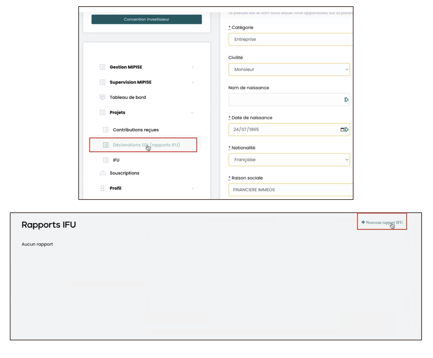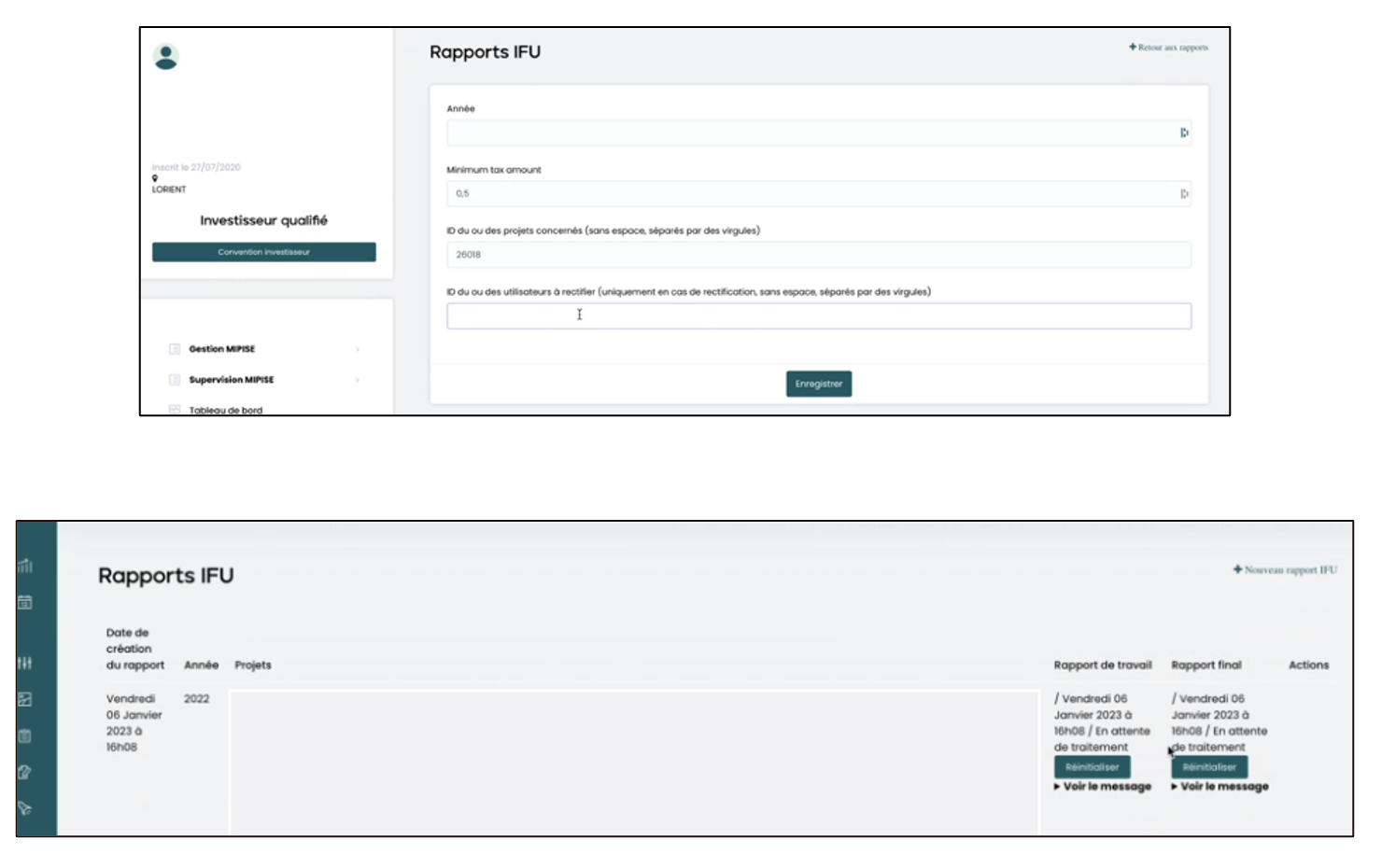 Une fois la déclaration acceptée par l’administration fiscale, et si vous avez opté pour la fonctionnalité de gestion poussée des IFU, vous serez en mesure de générer et de partager les IFU aux investisseurs sur votre plateforme, pour le nombre de projet qui a été paramétré.