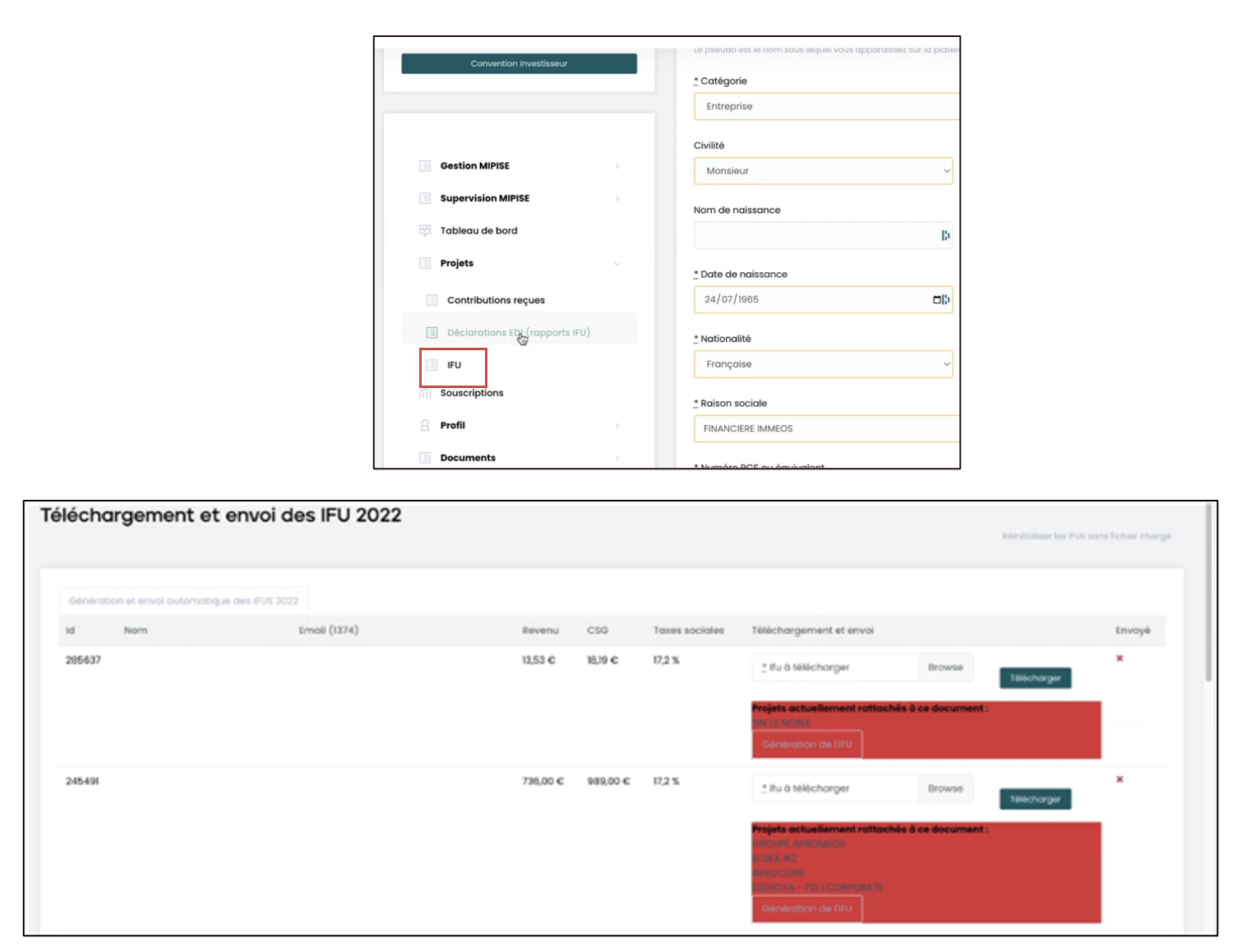 - Via le bouton « Génération et envoi automatique des IFUS 2022 », vous avez la possibilité de générer chaque CERFA unique et de la partager sur les espaces investisseurs.