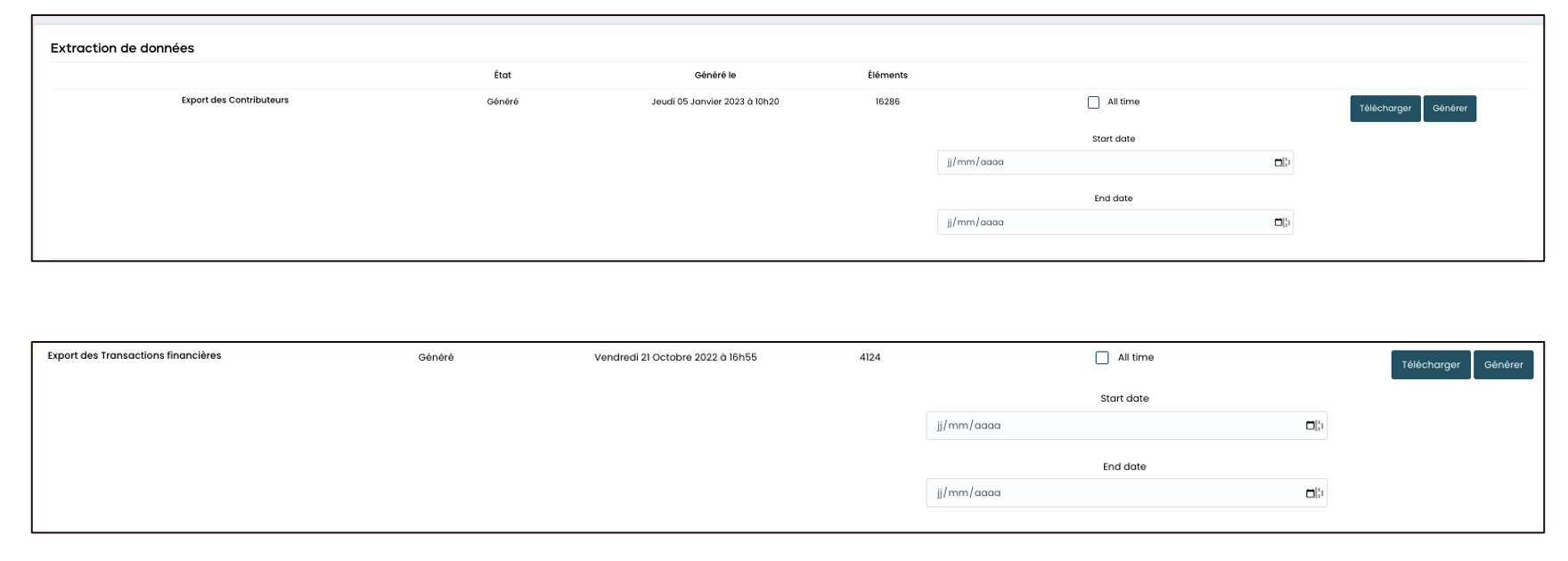 Choisissez « l’export des transactions financières » et « l’export des contributeurs » pour disposer de toutes les données nécessaires à votre déclaration.