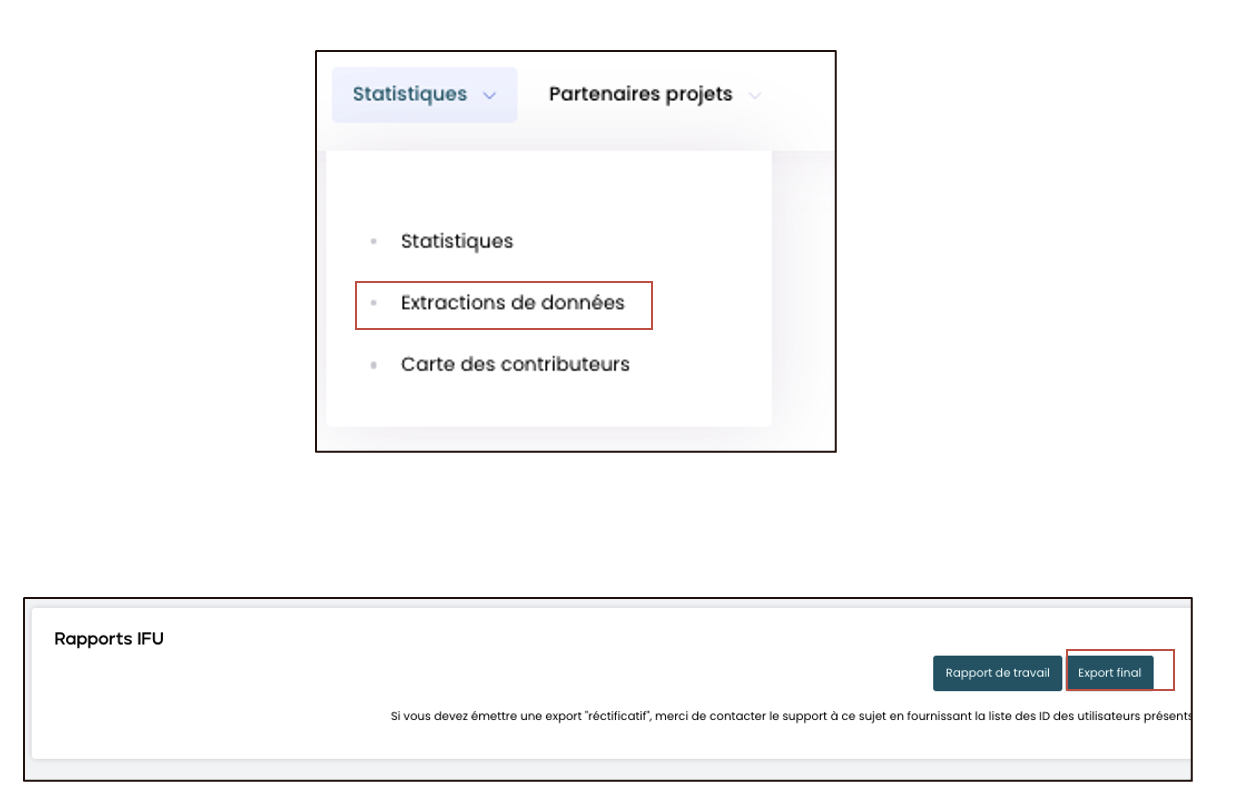 Vous pouvez y accéder avec un compte gestionnaire de plateforme, via »Statistiques » puis « Extractions de données ». Les rapports IFU se trouvent tout en bas de la page.